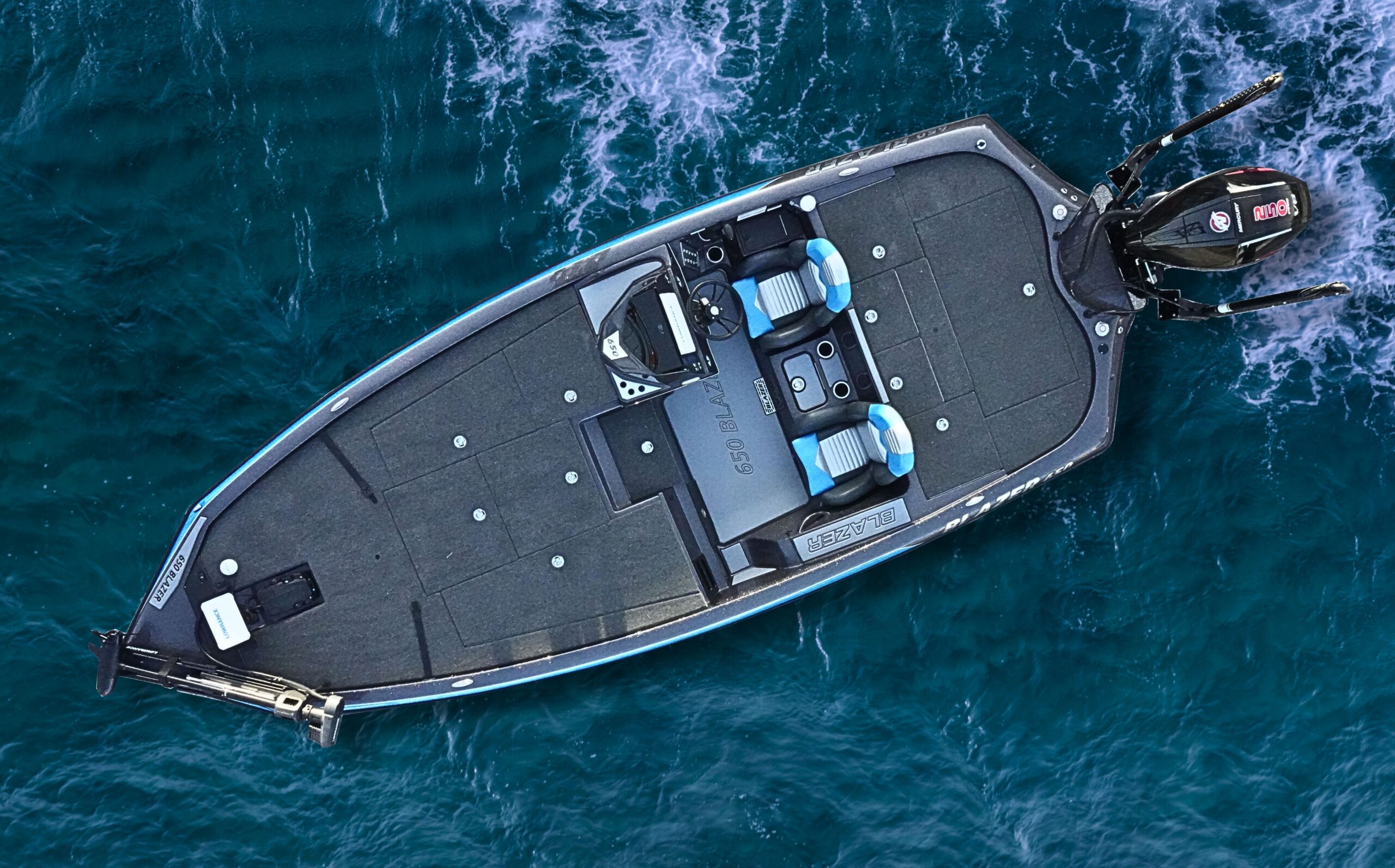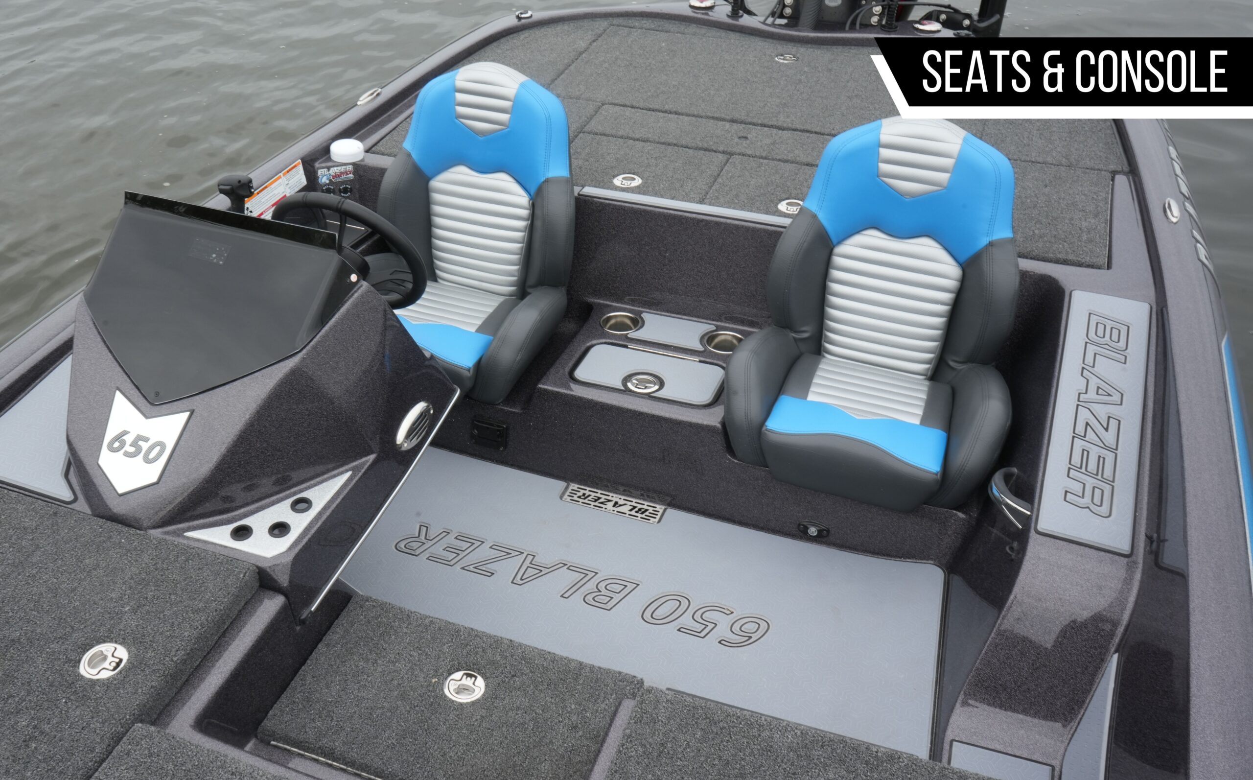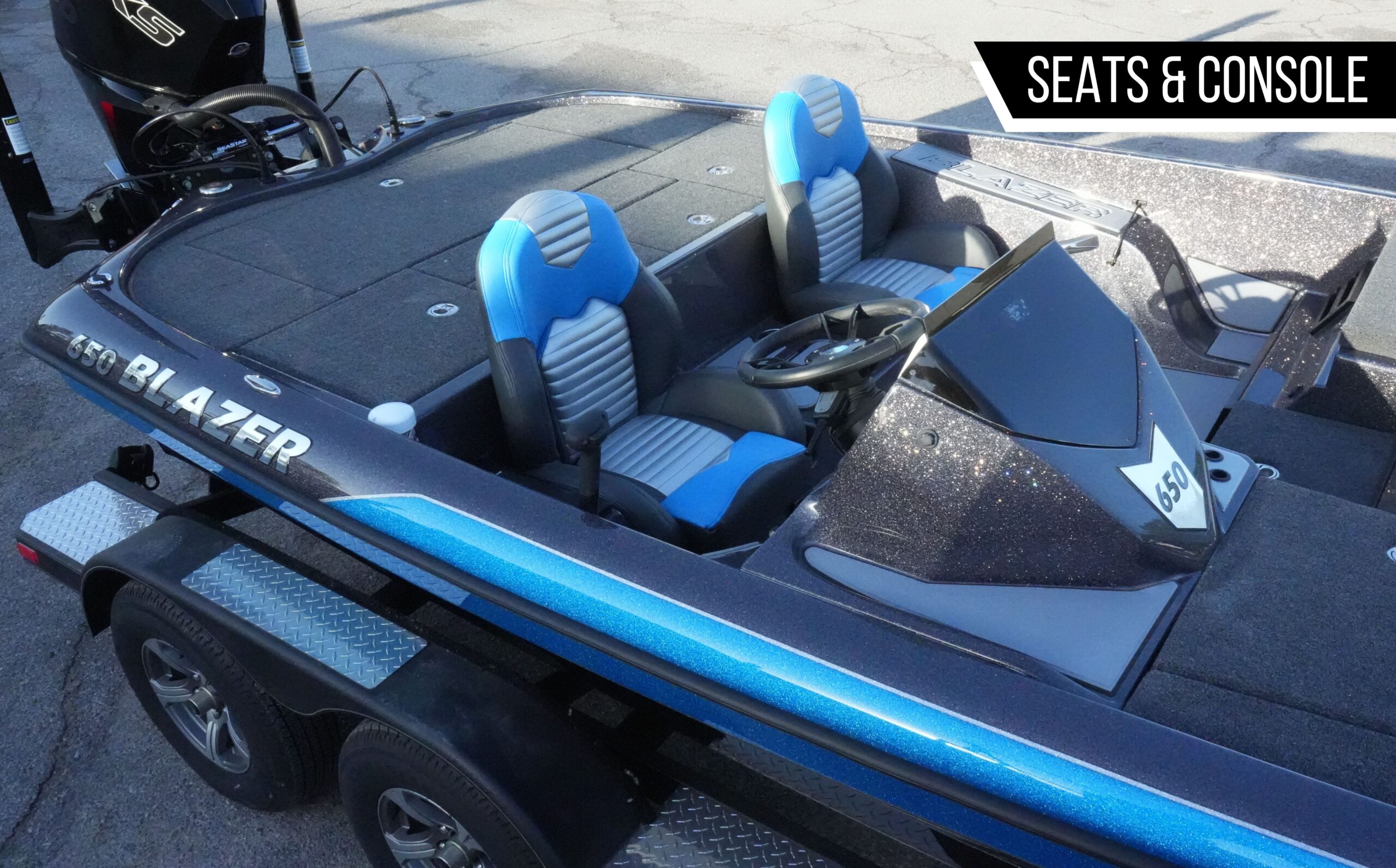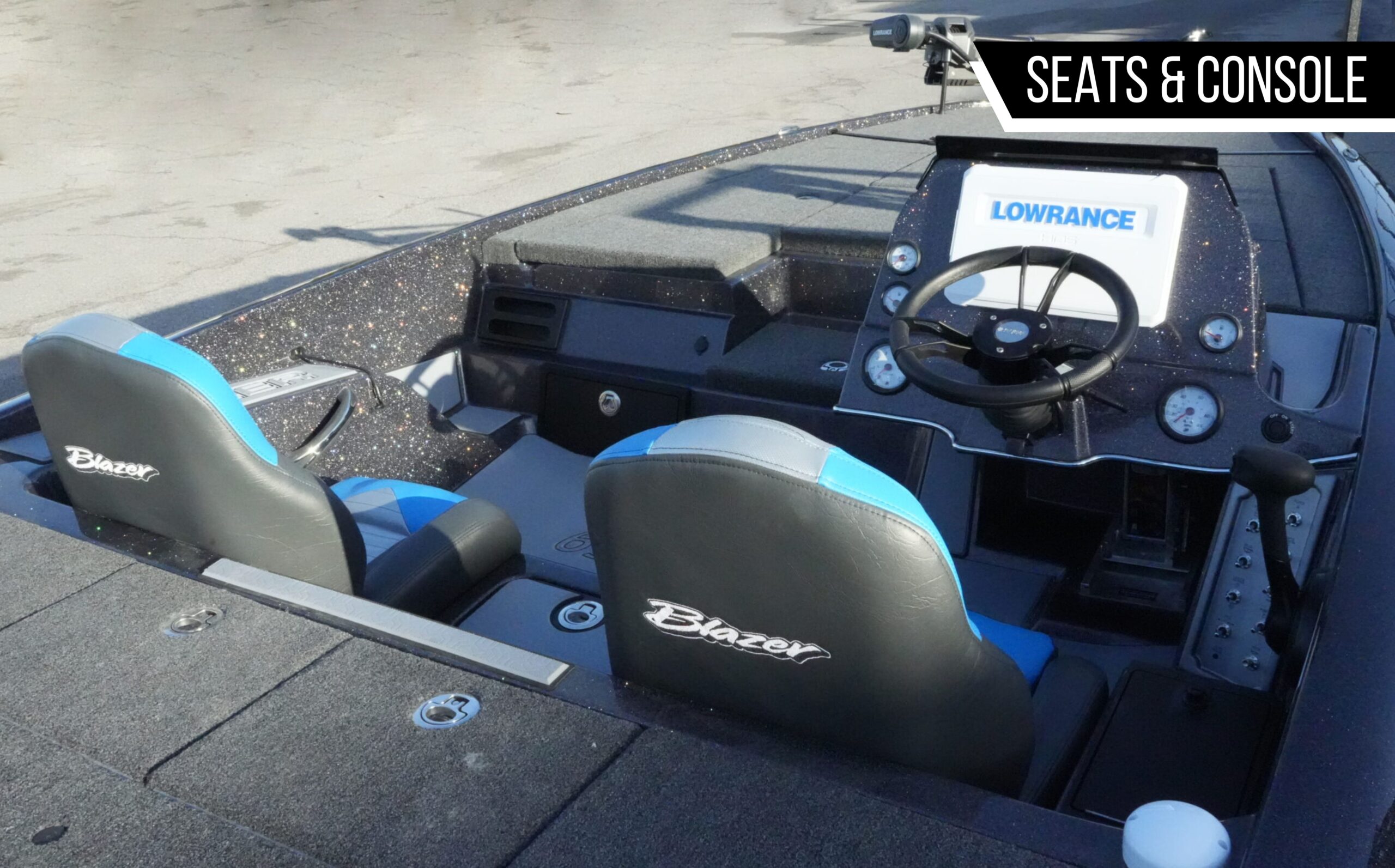 Experience the all new Blazer 650 NAP. It’s longer and wider while still maintaining the performance you’ve come to expect from Blazer’s best bass boats. The 650 NAP is packed with features that tournament anglers need to be at their best at every level, from the weekend angler up to the highest level of professional bass fishing. Measuring 21 feet 4 inches long with an 8-foot beam, this bass boat gives anglers more room to move and cast, with wide decks and spacious storage compartments.