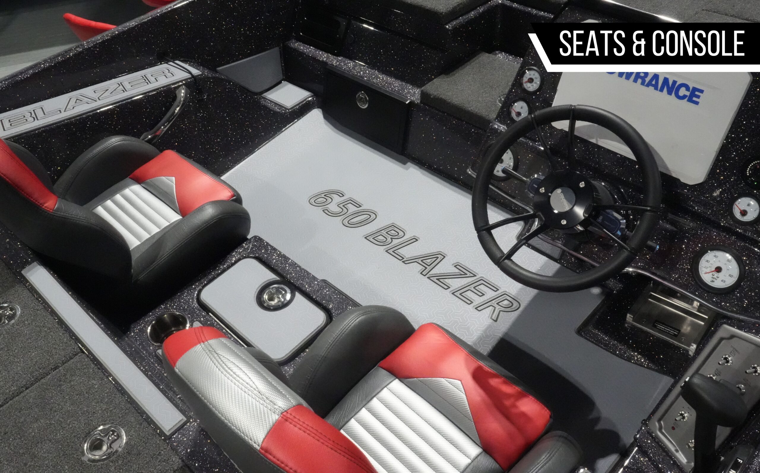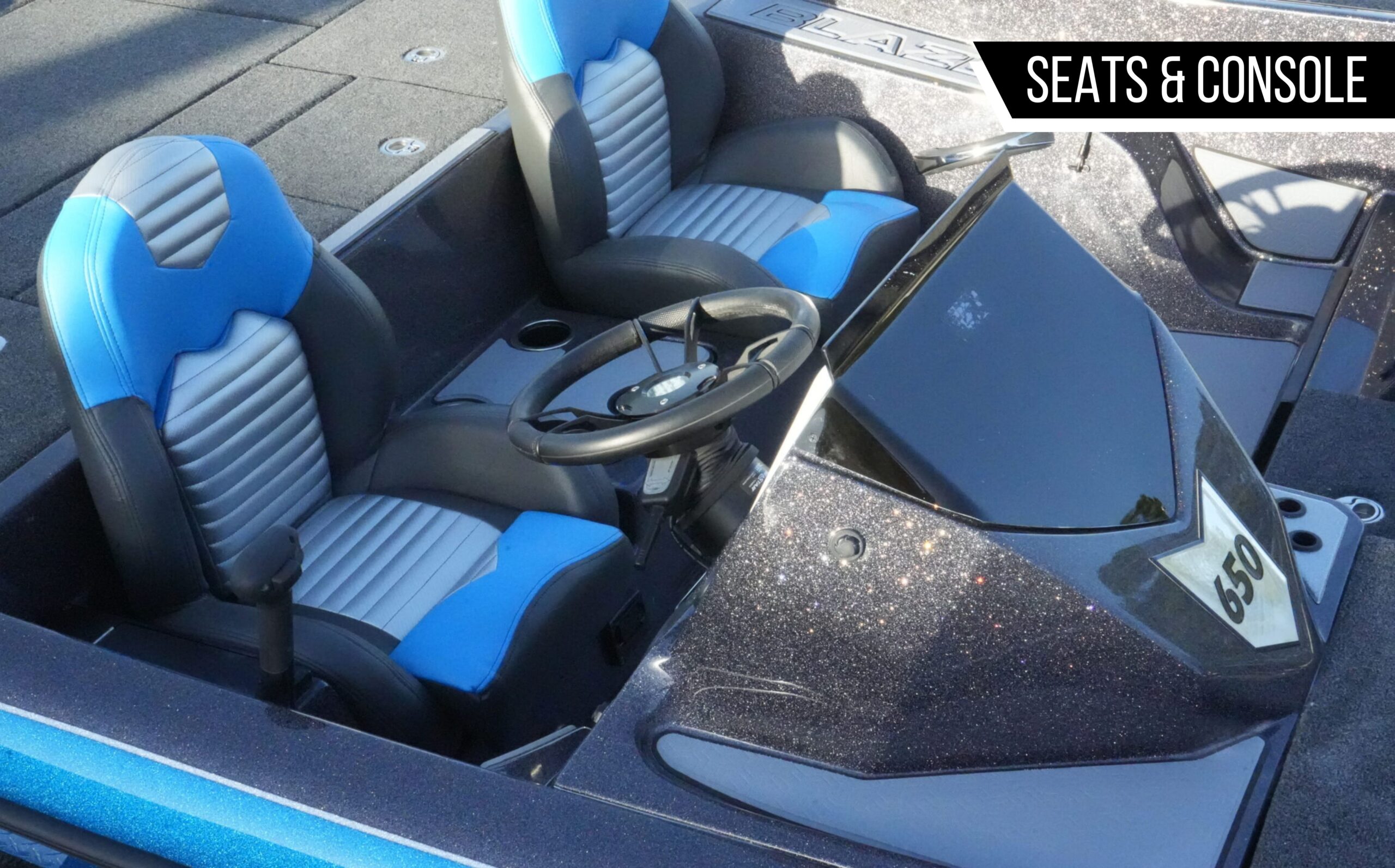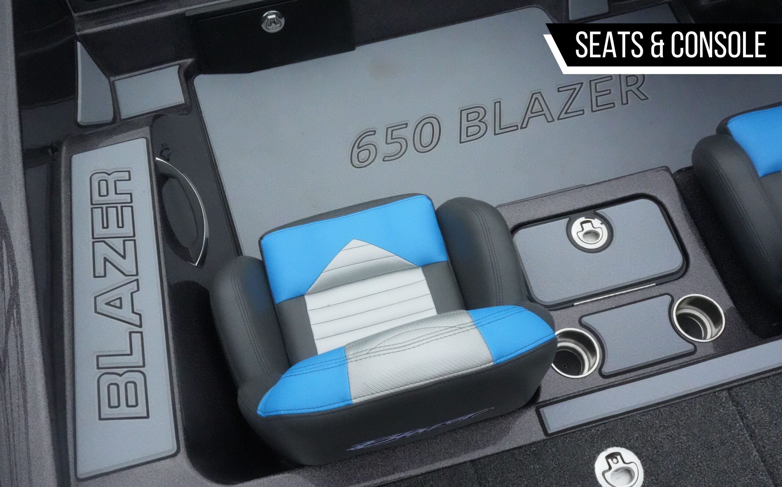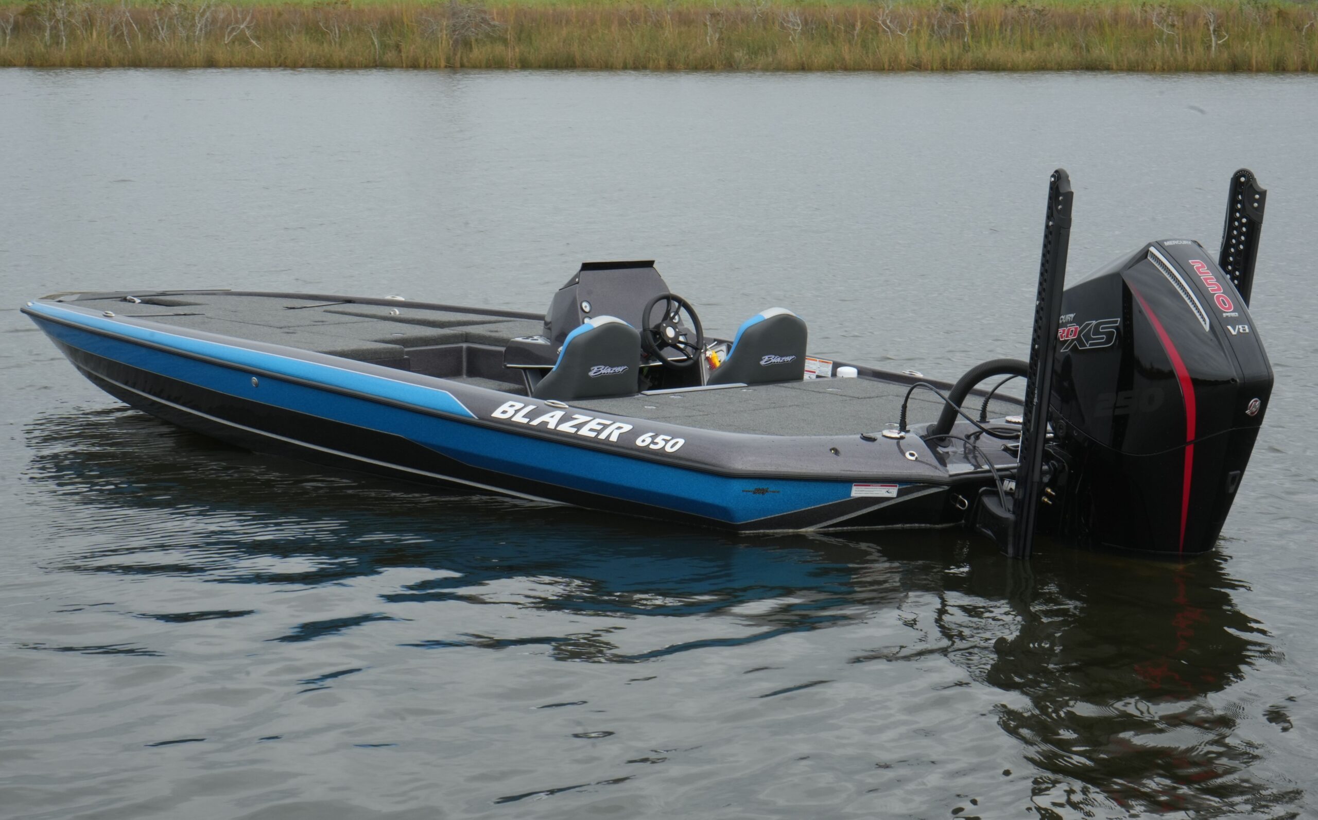 Experience the all new Blazer 650 NAP. It’s longer and wider while still maintaining the performance you’ve come to expect from Blazer’s best bass boats. The 650 NAP is packed with features that tournament anglers need to be at their best at every level, from the weekend angler up to the highest level of professional bass fishing. Measuring 21 feet 4 inches long with an 8-foot beam, this bass boat gives anglers more room to move and cast, with wide decks and spacious storage compartments.