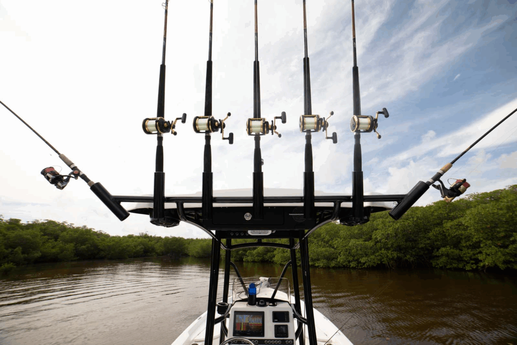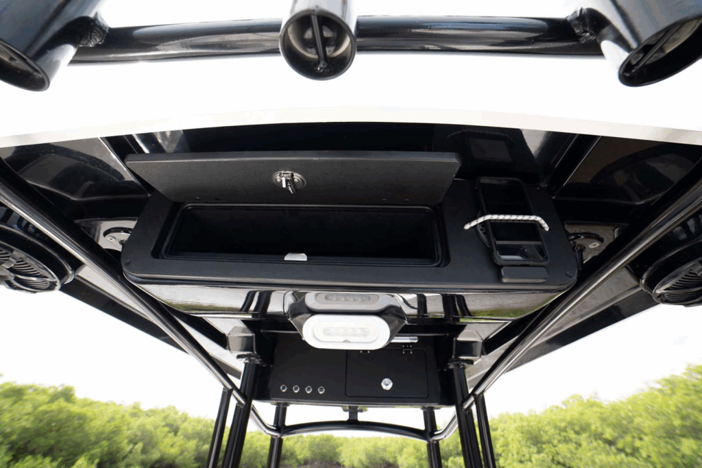 One of the optional features included in the Pro Package is a fiberglass T-Top which offers even more storage. Two small storage compartments are perfectly designed for cell phones, wallets, keys, or other personal items you may want to bring with you on your trip. There is also enough rod holders for up to seven fishing poles just on the T-top alone, not including the rod holders featured inset on the gunnels of the boat.