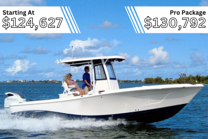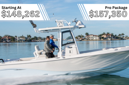 There is also increased customization when it comes to the look of your boat, with a powder coat package, and hull color of your choice being included. The console also comes with a Simrad Evo 3 9-inch depth finder. All together, the Pro Package increases the functionality and visual appeal of your boat at a total price of $103,459.