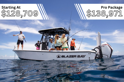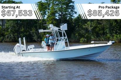 There are two boats in the Blazer Bay series with the same number: the 2400 and the 2400 Open Bay Striper. Despite the similar names, these boats have very different layouts and, as such, very different pro packages. The 2400 base model comes with a Suzuki DF 300 APX and starts at $67,533. The Pro Package, which comes out to $85,426, includes all of the following: hydraulic jackplate, 3-in-1 transducer, Simrad Evo 3 9-inch depth finder, power steering, trim tabs, T-top, powder coat package, and a hull color of your choice.