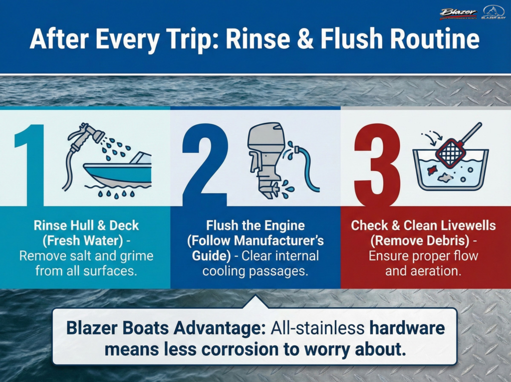 - Rinse the hull and deck with fresh water, especially after running in salt water. Salt left on stainless hardware, trim tabs, and engine components accelerates corrosion, even on premium marine-grade fittings.