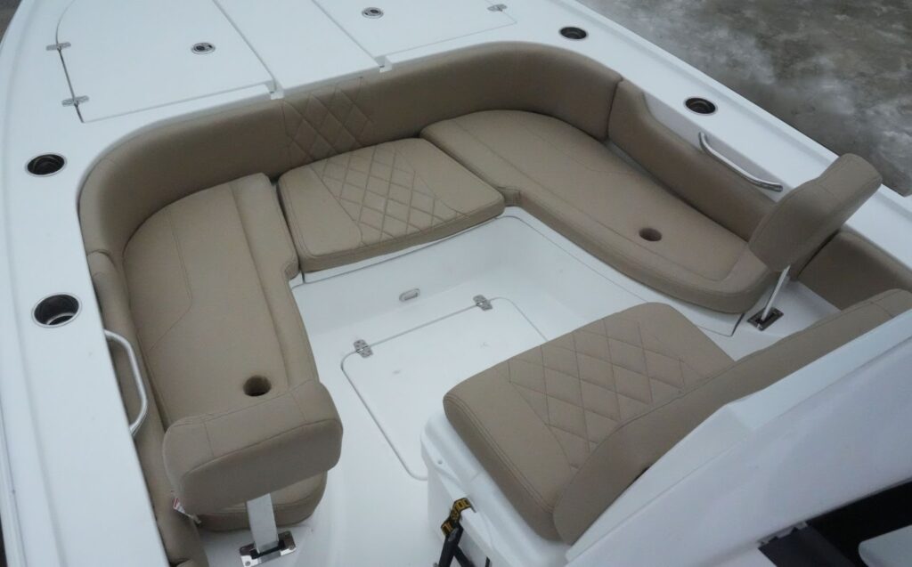 Most center console bay boats center on either having a large front deck for fishing or a comfortable lounge for sitting. The bow of the 2440 combines these two ideas into one by having a plentiful deck to fish from and an indented lounge for comfortable seating in a conversation pit style. With the addition of two removable back rests, these seats can be easily converted between facing backward and forward. Alongside an additional cooler seat and plenty of cupholders for the whole family, this space is optimally designed for family-friendly fun without sacrificing pro angler features.