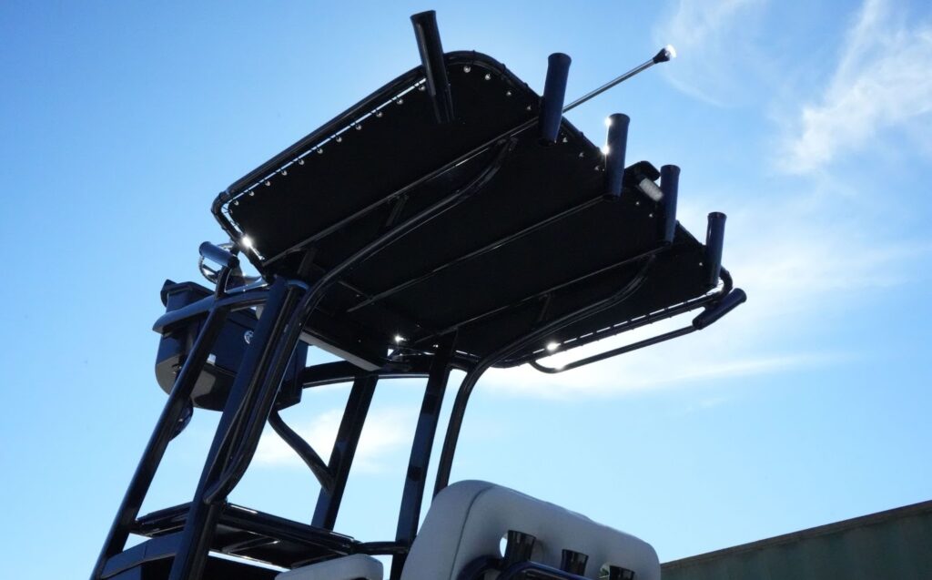 The first tower style is pictured below with a rigid fiberglass T-top structure supported by D-metal poles. The top has four built-in speakers and an additional storage compartment for personal items such as cell phones, car keys, and wallets. Along the back of the T-Top, there are several rod holders for additional storage.