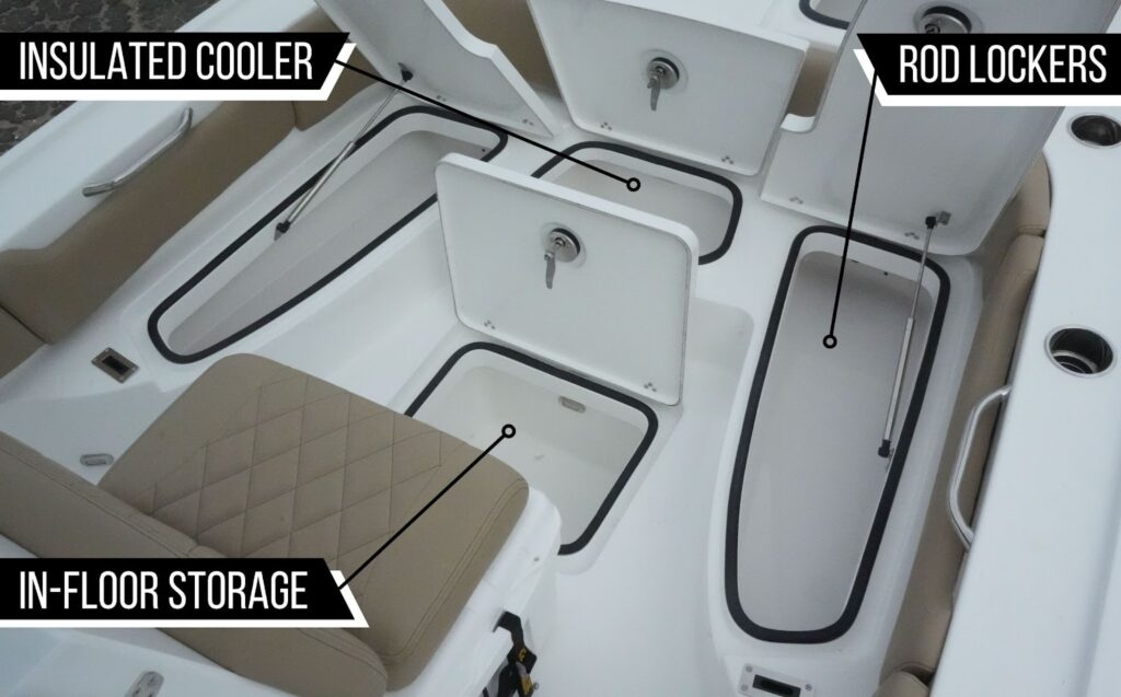 The Blazer Bay 2440 has several compartments for storage. On the front deck, there is an anchor box and two large insulated fish boxes. Then, under the seats in the forward facing lounge, there are two rod lockers and an insulated cooler. Finally, in the floor space, there is a multipurpose compartment that can be used to store netting or additional supplies.